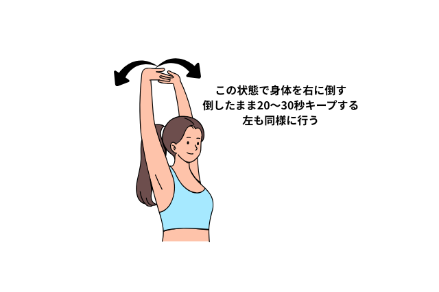 脇腹伸ばしをする際には、姿勢崩れに気をつけながら呼吸を忘れずに行いましょう。