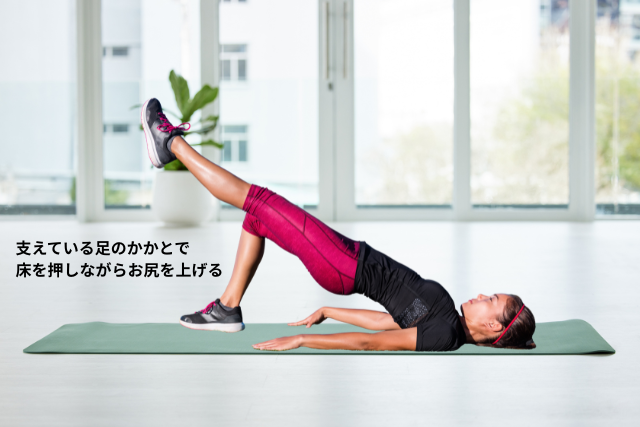 3.支えている足のかかとで床を押しながらお尻を上げる