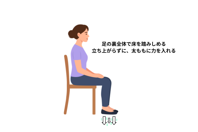 座位で行う簡易スクワット動作は、椅子に座ったまま行えるため、最も負荷が軽い方法です。実際に立ち上がらなくても、足を踏み込む意識を持つことで、太ももやお尻の筋肉を刺激できます。手順は、以下のとおりです。