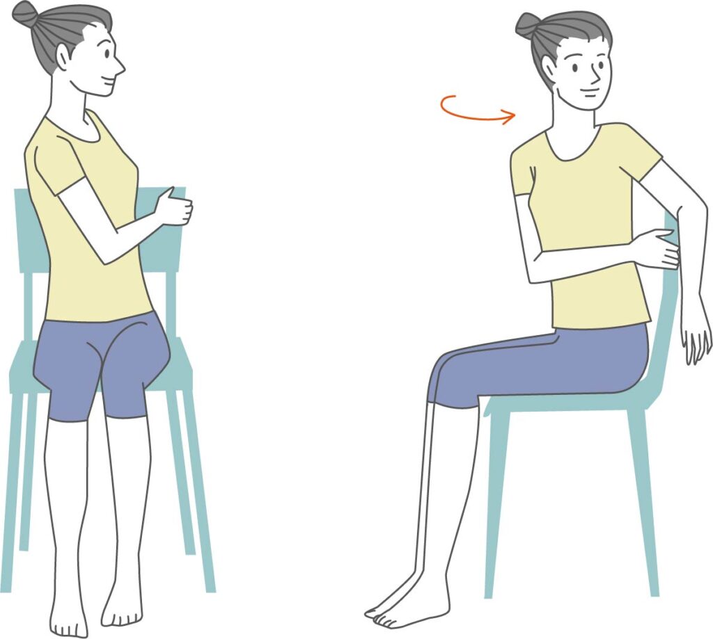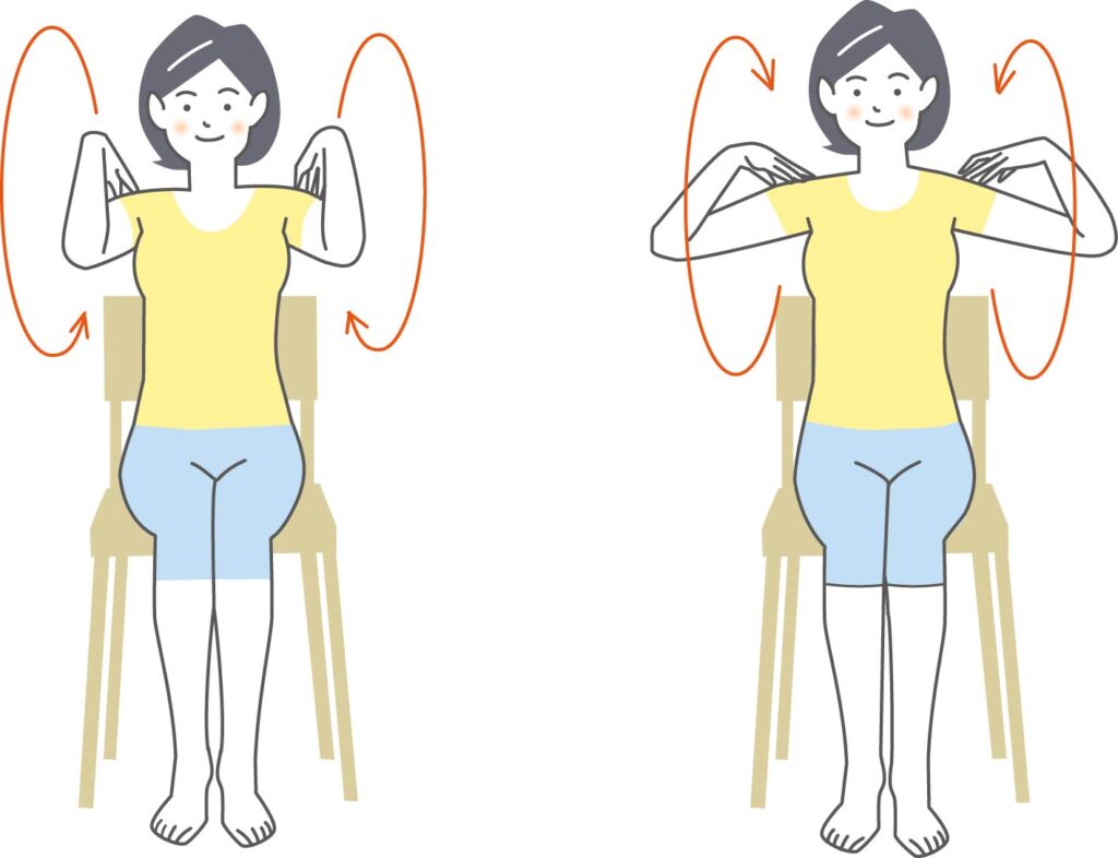 腕振りエクササイズは、椅子に座ったまま腕を前後に振り、肩甲骨回りを動かすエクササイズです。上半身の大きな筋肉を動かすことで血流がよくなり、全身の循環をサポートします。手順は、以下のとおりです。